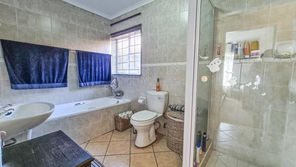 Sliding doors lead to a covered patio with a built-in braai, overlooking a private, easy-to-maintain and fully fenced pet-friendly garden. The kitchen offers a pantry and space for appliances, while the property is completed by double garages, additional paved parking, ample visitors parking, and fibre availability in the complex.