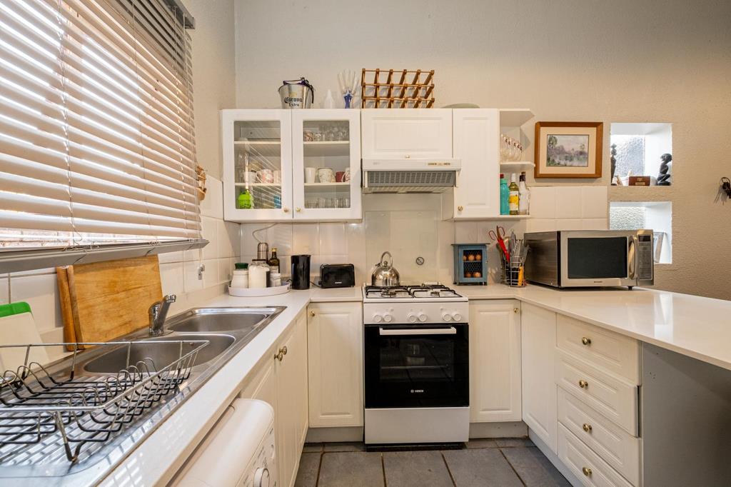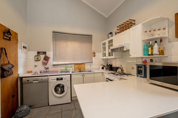 The kitchen has a breakfast nook and sufficient cupboard space with gas stove and place for two