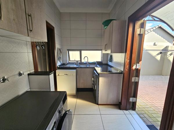 You will find an inviting entrance, 2 open plan living areas, an eye-catching kitchen with top class finishes, an extractor fan, breakfast nook, walk-in pantry & a separate scullery. 3 beautiful bright bedrooms with build in cupboards, main bedroom with spacious walk-in closet, 3 bathrooms . A low maintained small private garden, a double garage , and so much more!