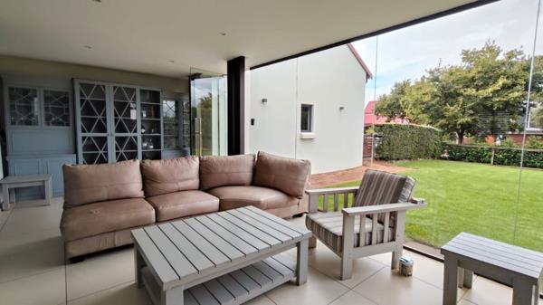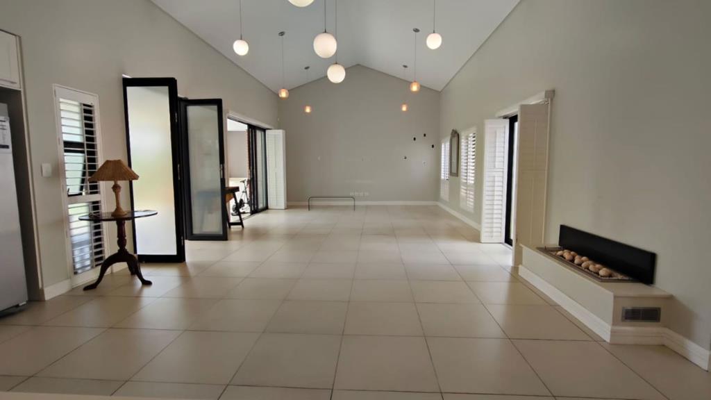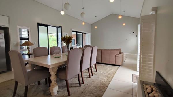 You are welcomed through a glass entrance into an enclosed patio featuring a built-in wood braai - an ideal space for year-round entertaining. Sliding doors effortlessly connect this area to the heart of the home, where an expansive open-plan living area unfolds. The living room, dining room and kitchen are thoughtfully positioned on one side, creating a cohesive and sociable environment. The dining area is enhanced by a stylish gas fireplace, adding both charm and warmth.