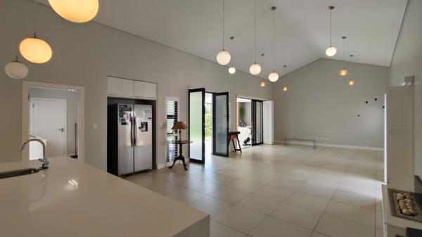 The contemporary kitchen is fitted with sleek Caesarstone countertops, a central island with a breakfast bar, and a premium Miele oven and gas stove with an extractor fan. A generously sized scullery and laundry area is conveniently located just off the kitchen, ensuring practicality without compromising on aesthetics.