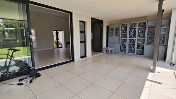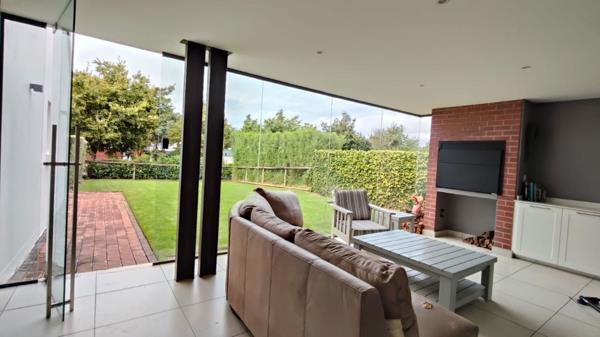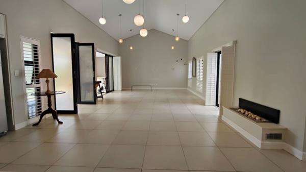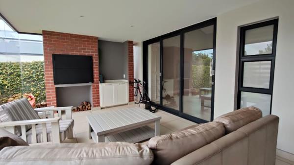 You are welcomed through a glass entrance into an enclosed patio featuring a built-in wood braai - an ideal space for year-round entertaining. Sliding doors effortlessly connect this area to the heart of the home, where an expansive open-plan living area unfolds. The living room, dining room and kitchen are thoughtfully positioned on one side, creating a cohesive and sociable environment. The dining area is enhanced by a stylish gas fireplace, adding both charm and warmth.