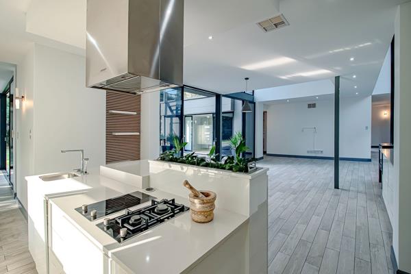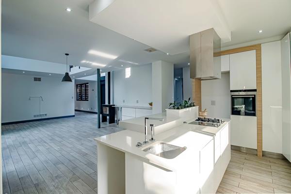 The modern, open-plan kitchen is a chefs dream, equipped with a gas hob, induction plates, Siemens oven, and sleek high gloss push-to-open storage cabinets. The spacious scullery offers ample room for appliances, maintaining a clean and stylish aesthetic.
