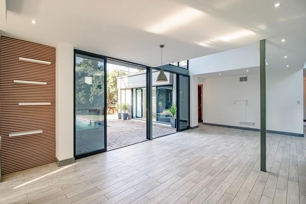 The expansive open-plan living area, crowned by a cozy fireplace, seamlessly flows through double-glazed aluminum sliding doors onto a beautifully manicured garden perfect for family gatherings and alfresco entertaining. An elegant entertainment room featuring a built-in braai, ceiling fans, and sliding glass doors opens onto the garden and inviting swimming pool, creating your private oasis.