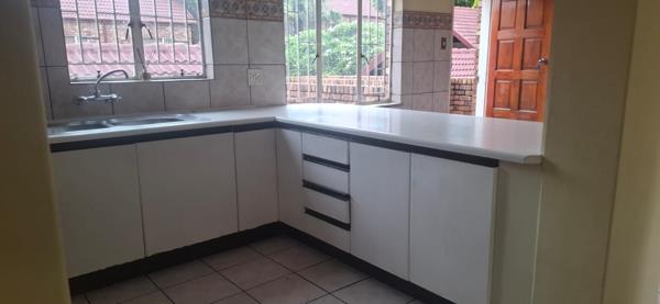 This well-maintained 2-bedroom, 1-bathroom unit offers practical and secure living within a desirable complex in Zwartkop, Centurion. The interior features a functional layout, comprising a comfortable lounge, a dedicated dining room, and a well-appointed kitchen. The kitchen boasts modern light-colored cabinets, clean white countertops, a double stainless steel sink, and a freestanding stove, complemented by a tiled backsplash. Tiled flooring extends throughout the living areas and kitchen, ensuring easy maintenance and a cohesive aesthetic.