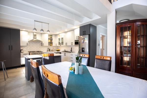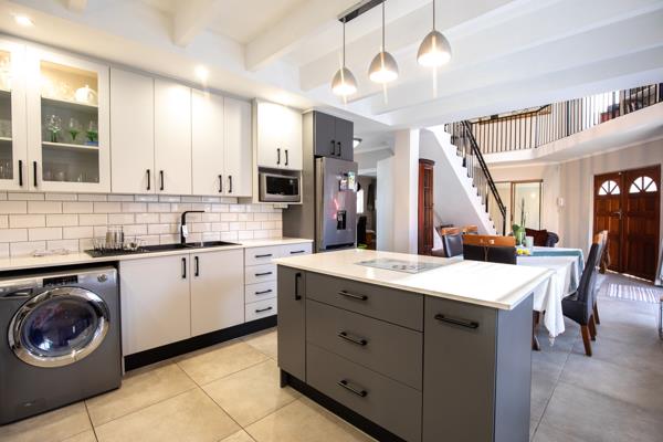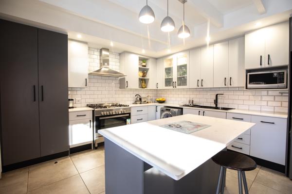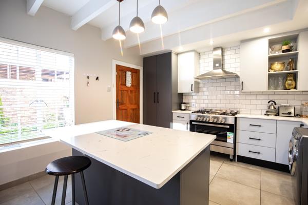 The heart of this exquisite home is its meticulously renovated, open-concept kitchen. A culinary dream, it boasts stylish two-tone cabinetry, a pristine subway tile backsplash, and a suite of modern stainless steel appliances, including a gas range and a large refrigerator. A central island with integrated seating offers a perfect spot for casual dining or entertaining, while ample storage solutions, including a large pantry cabinet, ensure effortless organisation. The seamless integration of a washing machine within this space speaks to a design focused on both aesthetics and practicality. Adjacent to the kitchen, the dining area flows effortlessly into the main living spaces, all bathed in abundant natural light streaming through large windows and sliding doors, which are thoughtfully secured with integrated security gates.