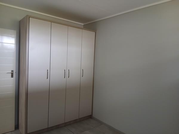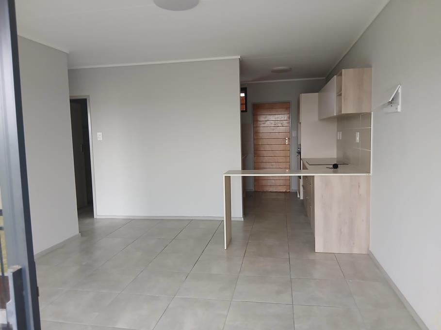 The unit offers an open-plan living area and kitchen with built-in cupboards, creating a practical and comfortable living space.