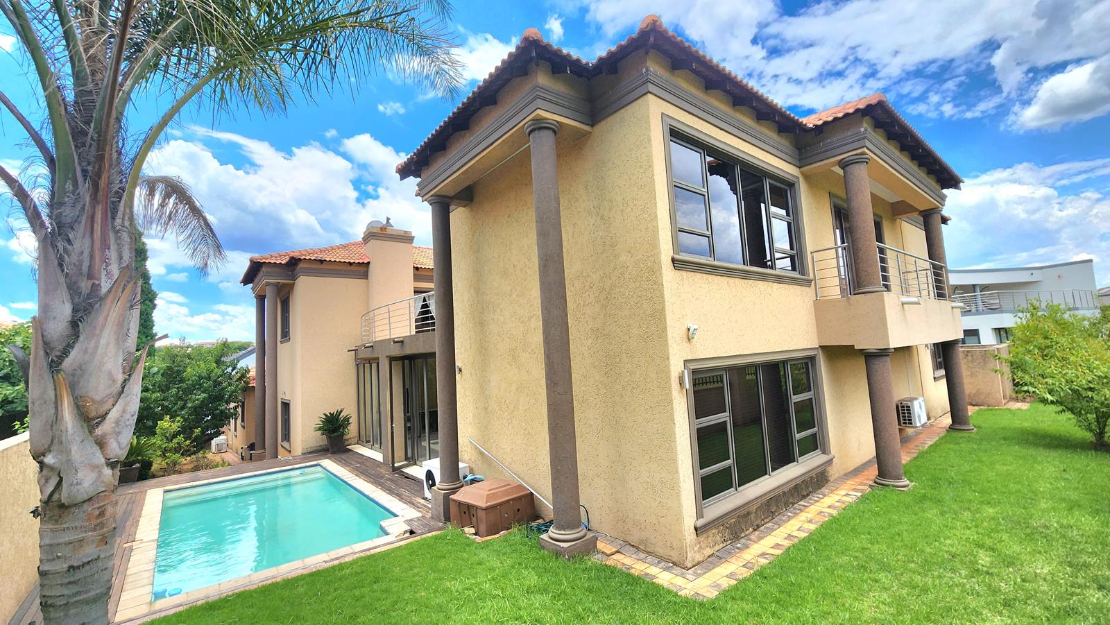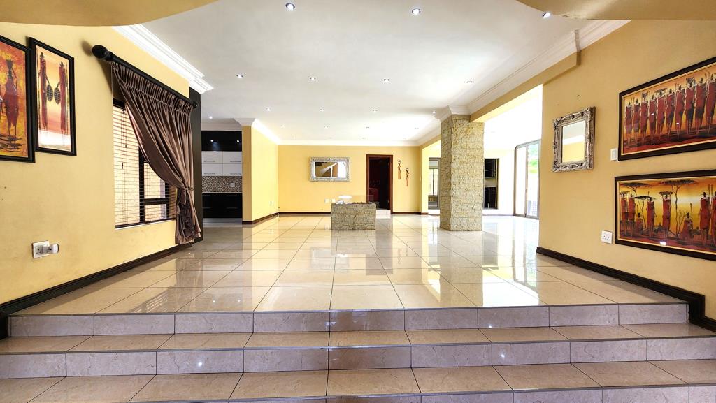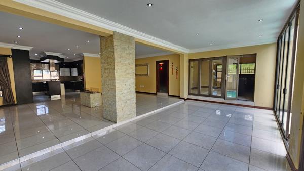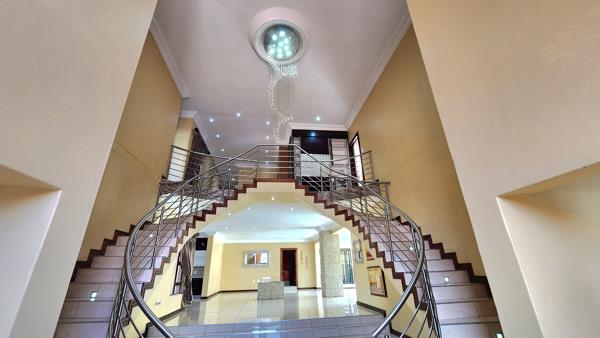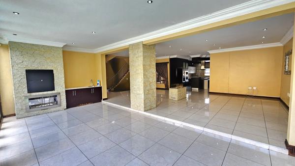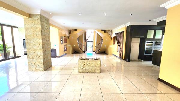 Entering the home, you are immediately struck by the impressive double-volume ceilings and striking double staircases, creating a grand sense of arrival. The reception area flows effortlessly into the dining and living spaces, all centred around a spacious, elegantly finished kitchen. The kitchen is equipped with a built-in oven, coffeeespresso machine, space for two double-door fridges, and a large scullery designed for practicality and ease. Ideal for entertaining, the home also boasts a private cinema room and an enclosed bar. The living areas extend to a beautifully finished patio with a built-in braai, perfect for relaxed indoor-outdoor living.
