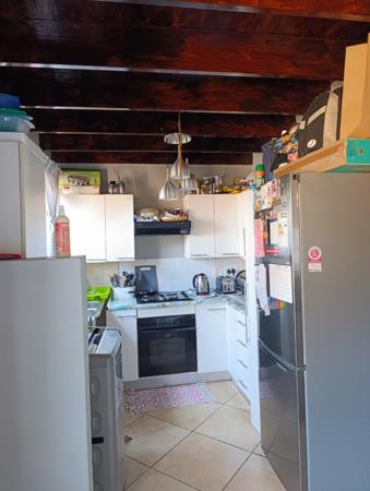 The interior features a functional kitchen equipped with modern white cabinetry, an integrated oven and hob, and sleek stainless steel appliances. Exposed wooden ceiling beams add a touch of character, complemented by durable tiled flooring throughout. The spacious living area also boasts these distinctive wooden beams, ample natural light, and provides a versatile space for relaxation and entertaining.