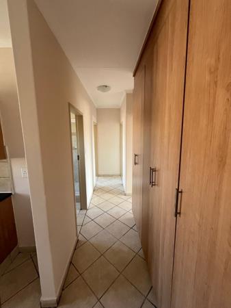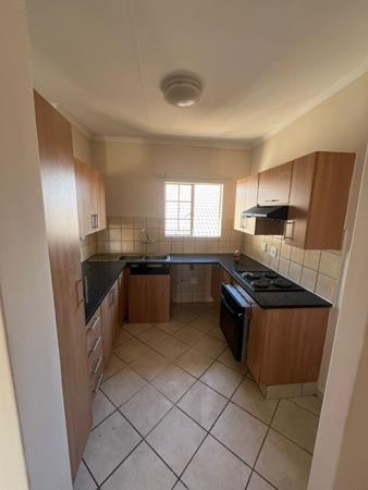 This property in Celtisdal offers comfortable living with a focus on practicality and security. The residence features an open-plan living area, bathed in natural light from large windows and a sliding door, creating an airy and welcoming atmosphere. The functional U-shaped kitchen is equipped with wood-toned cabinetry, dark countertops, a double sink, and a built-in stove with an extractor fan, complemented by tiled floors and a practical backsplash. Step out onto the private balcony, complete with a built-in braai, perfect for outdoor entertaining.