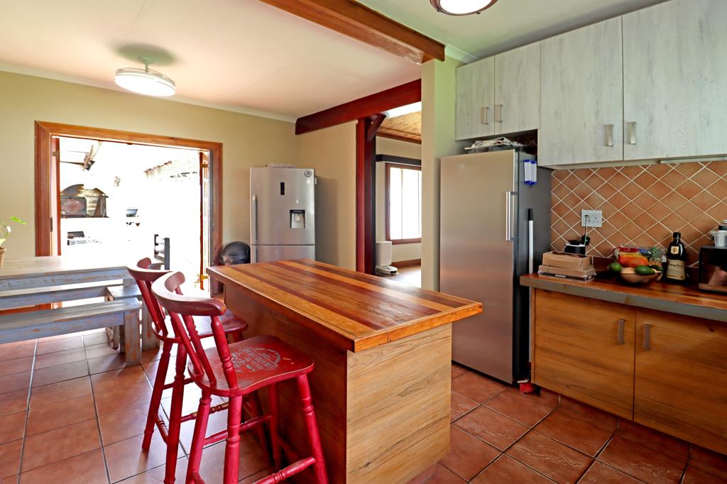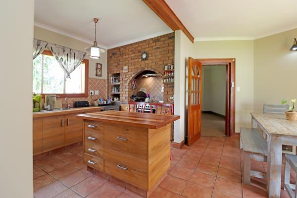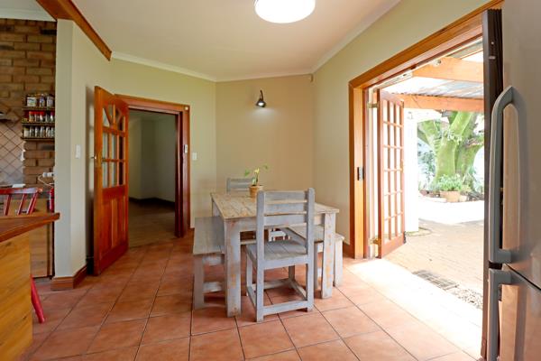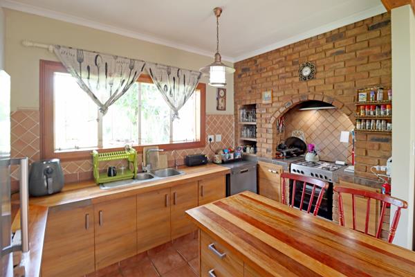 The entertainment area with a built-in braai creates the perfect space for hosting family and friends while overlooking the well-maintained garden and heated swimming pool ideal for year-round enjoyment.