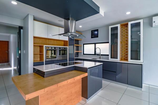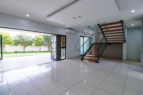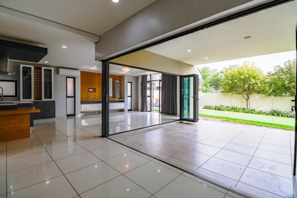 The heart of the home is a beautifully appointed open-plan kitchen that flows seamlessly into expansive living and dining areas. Stacking doors open onto a covered patio complete with a built-in braaiperfect for year-round entertainingoverlooking a sparkling pool and manicured surroundings.