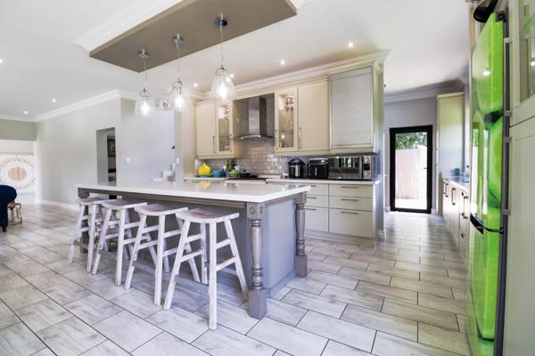 Designed with entertainment in mind, the ground floor features expansive living spaces that flow seamlessly between the dining area, lounge, and a fully enclosed patio complete with a built-in braai perfect for hosting year-round. A stylish built-in bar and a second lounge with a cosy fireplace provide additional spaces to relax and entertain.