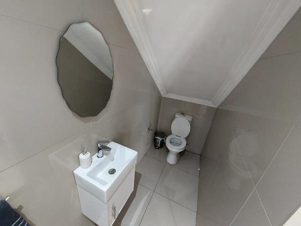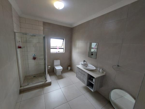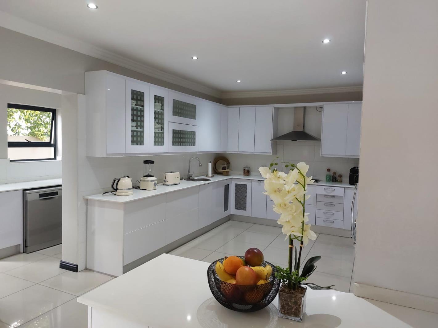 Downstairs features a modern open-plan kitchen and dining area. The kitchen is well-equipped with granite countertops, a 4-plate gas stove, 2-plate electric stove, eye-level oven, and built-in microwave. A separate scullery with laundry facilities adds extra convenience.