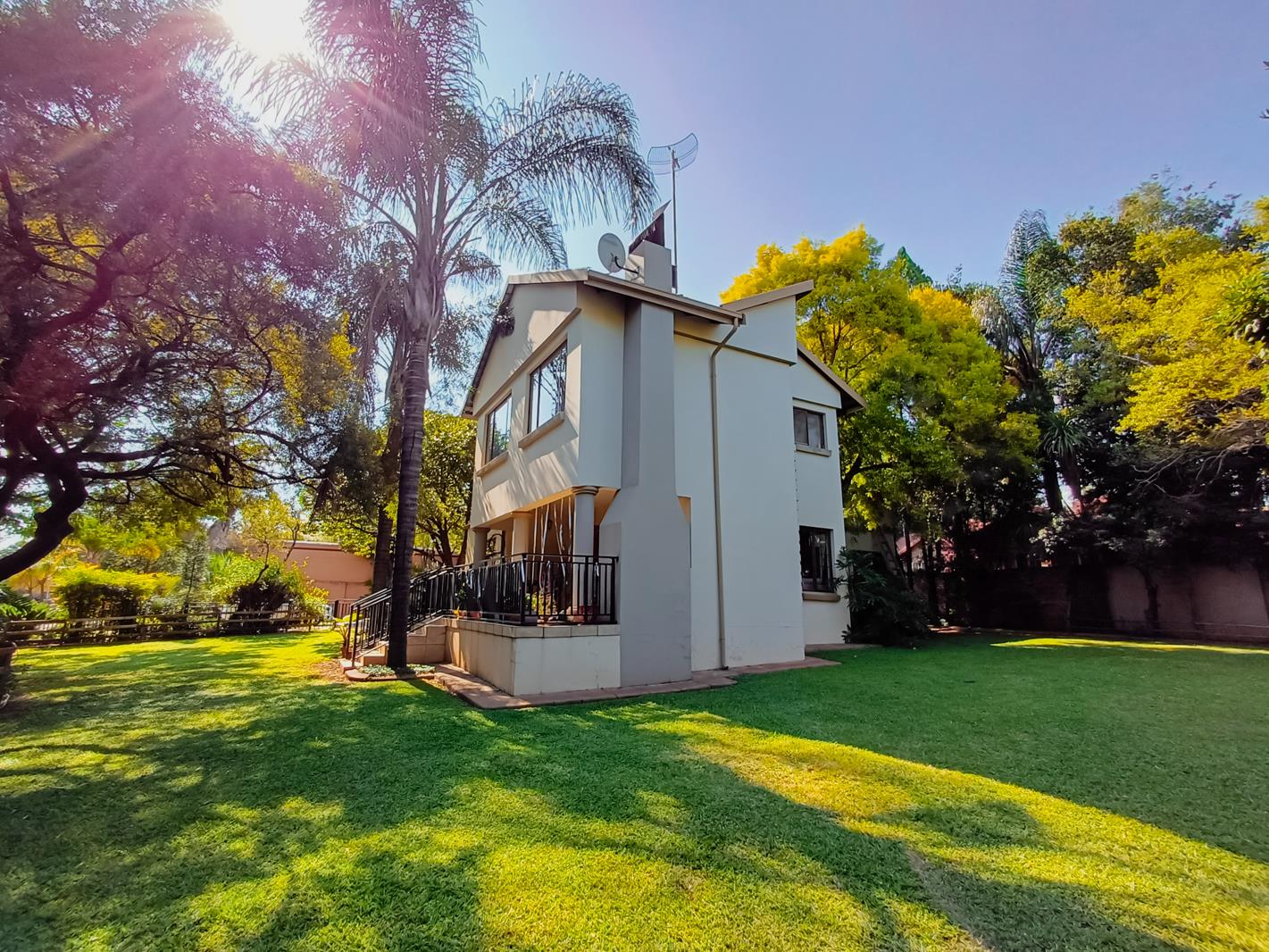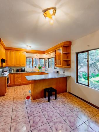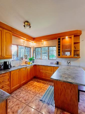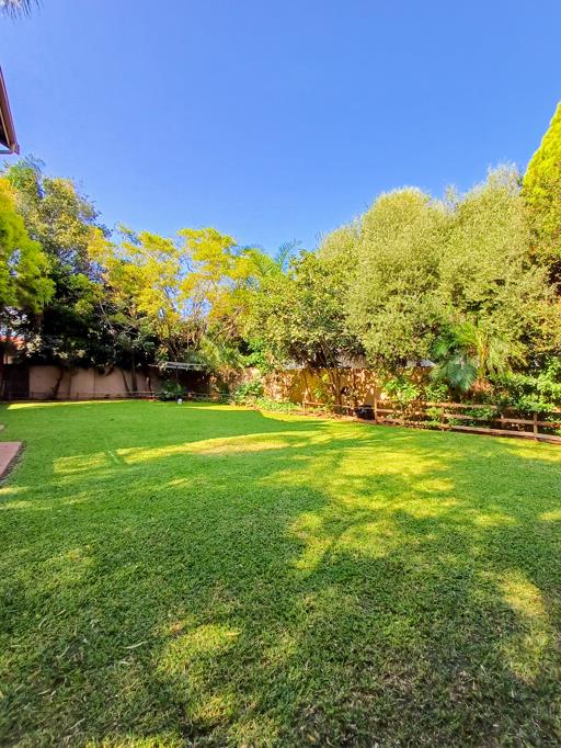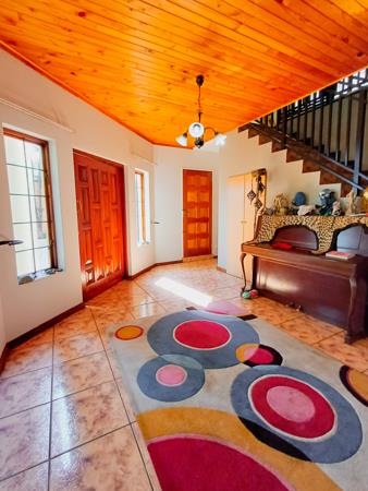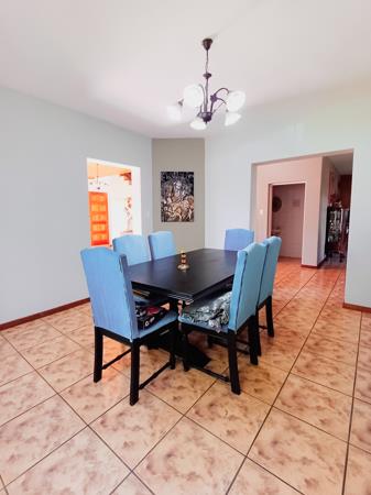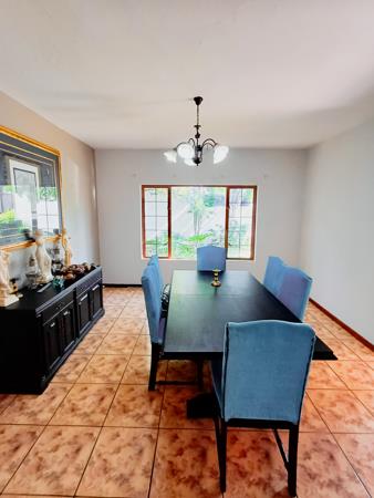 This home boasts two formal rooms, each offering a distinct ambiance. The second formal room opens out to a patio equipped with a built-in braai, perfect for hosting gatherings or enjoying alfresco dining. From here, steps lead down to the open garden, enveloping the property in natural beauty.