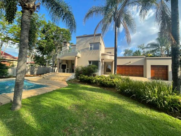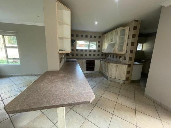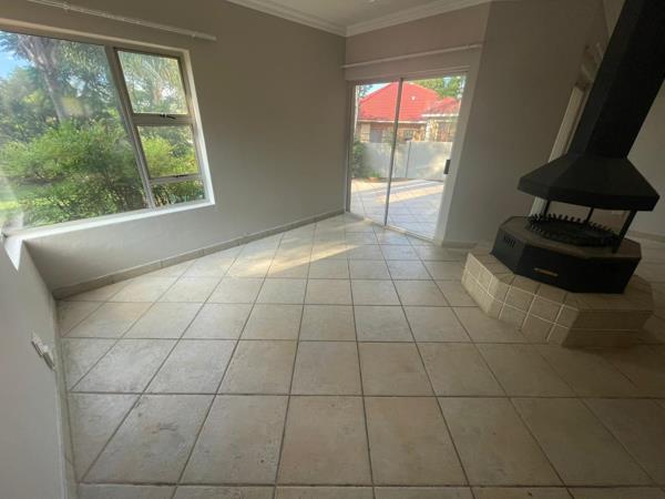 The spacious kitchen with light oak cupboards and adjoining scullery flows to the backyard. The formal lounge and family room are separated by a cozy fireplace. Outdoors, a landscaped garden with mature trees, lawn, swimming pool, large braai area, and private courtyard provides ideal space for entertaining.