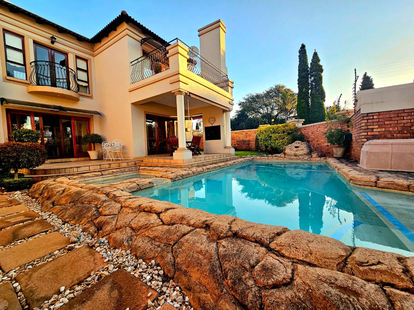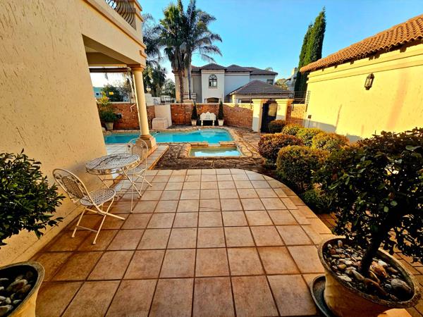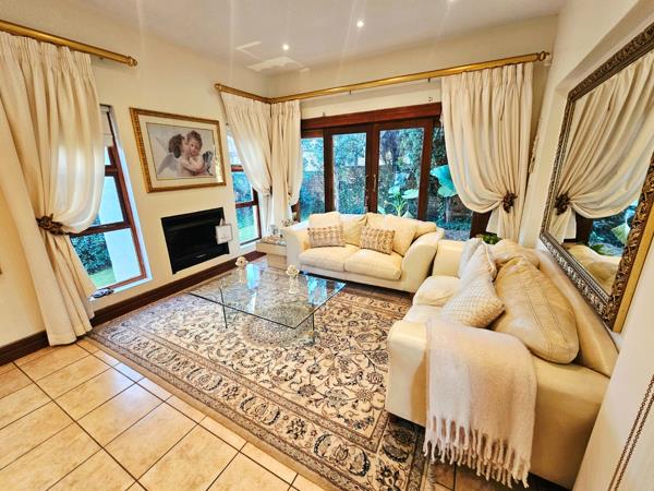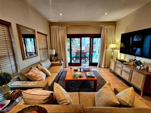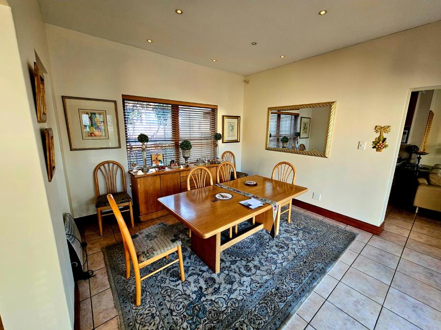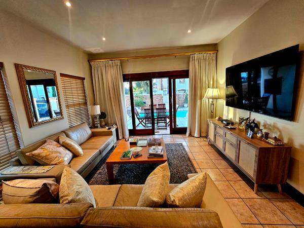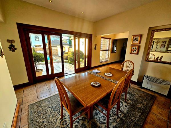 Elegant dining room with French doors that lead to the inviting pool area. The TV lounge extends onto a patio equipped with a built-in braai, ideal for family gatherings and entertaining guests.