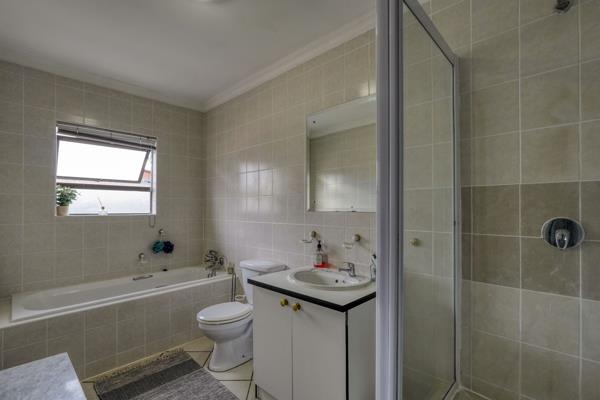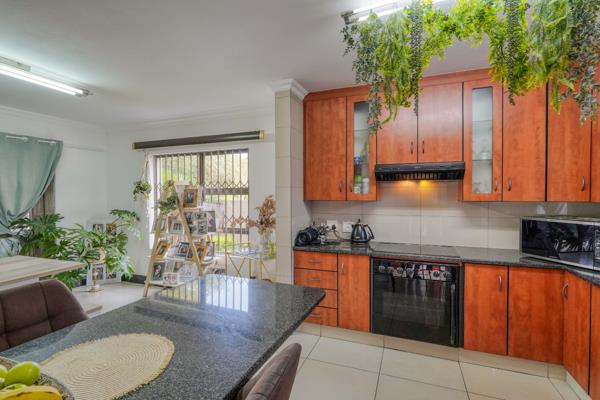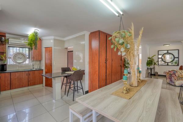 Downstairs, the open-plan layout brings the living spaces together with ease. The dining area sits between the lounge and the covered patio, making indoor-outdoor entertaining effortless, while the patios built-in braai promises relaxed weekends. The kitchen is neatly tucked into the corner for privacy and convenience, with a separate scullery keeping appliances out of sight.