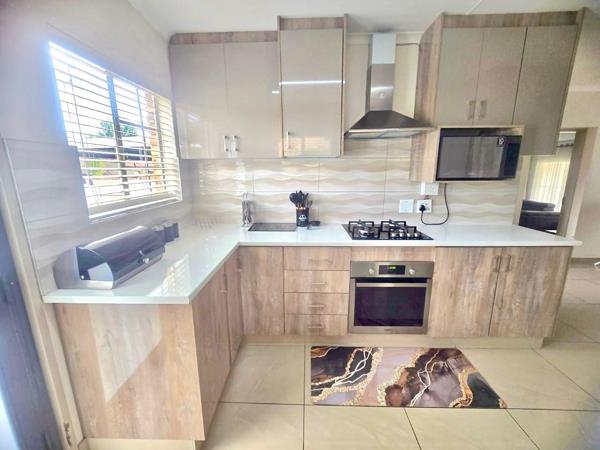 The kitchen is modern, smartly designed, and both stylish and practical, featuring sleek gloss cabinetry, durable stone countertops, and a gas stove that adds both efficiency and convenience. A separate scullery area enhances functionality while maintaining the clean, streamlined look of the main kitchen space.