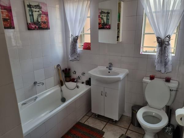 Step outside to a private, covered patio with paved flooring, perfect for outdoor entertaining, complete with a built-in braai. The property boasts a small, well-maintained garden and lawn, providing a tranquil outdoor retreat. Parking is ample with one garage and two additional parking spaces. This residence is ideal for families or professionals seeking a comfortable and secure living environment.