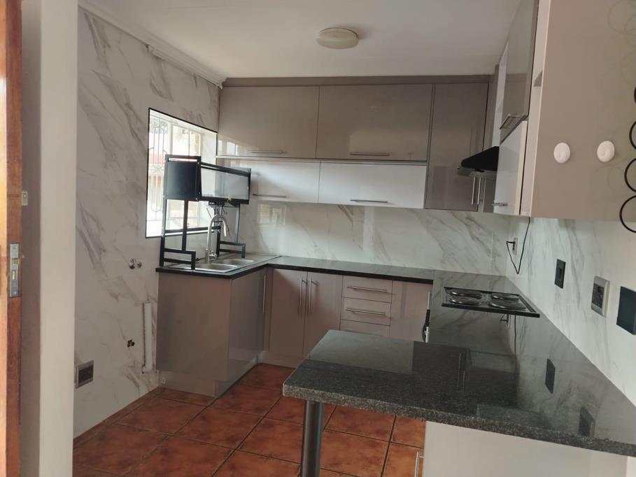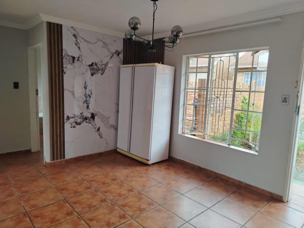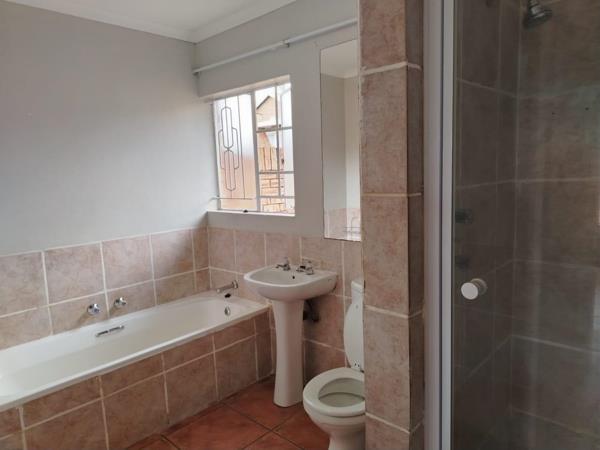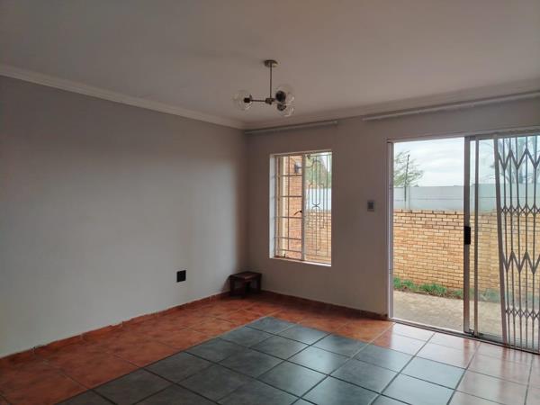 The simplex offers an open plan lounge and dining area. The kitchen has space for a single door fridge and 2 under counter appliances. There are 2 bedrooms and one full bathroom. In the paved backyard with a flower bed you can sit and relax. Prepaid electricity and R500 is payable towards the water and sanitation account monthly.. There is a swimming pool and a large play area in the security complex. Up to two small dogs will be allowed. No cats will be allowed.