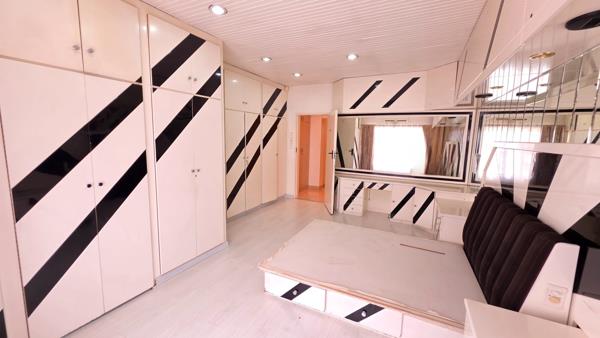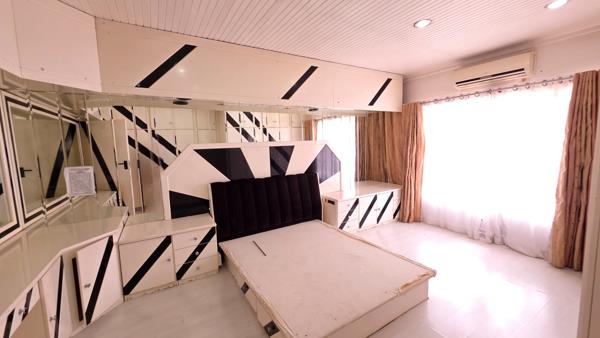 Fourth bedroom: Laminate flooring, built-in cupboards, en-suite bathroom shower, toilet, basin, large cupboard space, mirror headboard, and air-conditioning.