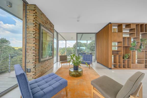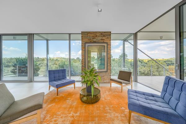 The landscaped grounds are curated for both entertaining and tranquil reflection, with multiple seating areas designed for alfresco dining and sunset gatherings. A gently flowing river borders the property, its soothing soundtrack enhancing the homes peaceful farm style ambiance and creating a rare connection to nature. Riverfront stands within Monaghan Farm are limited and protected by surrounding green belts, ensuring uninterrupted vistas set in authentic African tranquillity.
