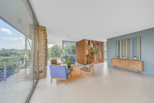 Expanses of glass and sliding doors wrap around the home, flooding the interiors with natural light and creating seamless indoor and outdoor living from every angle. The elevated positioning enhances panoramic views across protected green belts and river corridors, reinforcing both privacy and presence.
