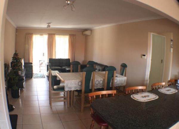 Okahandja 8 is a modern all tiled 2-bedroom unit with En-suit and second bathrooms. A double garage with remote controlled doors and a door leading direct into the living area. It is situated in Okahandja, a quiet security complex in Rooihuiskraal North. Ideal for a small family. It also offers open plan dining and lounge as well as a modern equipped kitchen with ample cupboards with an extraction fan above the stove. A large linen cupboard in the passage is installed. From your lounge you walk out onto the covered patio with built in braai that leads to the private fenced off garden which is pet friendly (sorry no cats). As a small bonus there are 3 parking bays just across the alley for visitors only. Perfectly situated near Highways and shopping complexes like Mall @ Reds. A number of prestigious schools nearby. A water connection and drain for a top-loader washing machine is installed in the double garage if needed. The geyser is installed with a timer to minimise the electricity usage to a minimum. Electrical and other services are for the tenant's account. Ample open visitors parking. A must see.