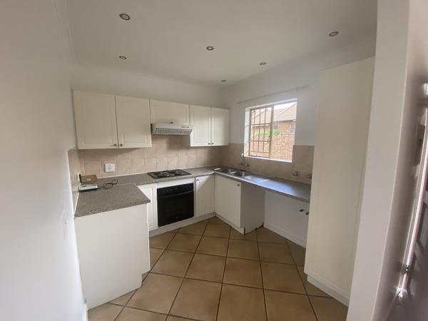 The home features a generous open-plan living and dining area, filled with natural light and finished with easy-to-maintain tiled flooring. The kitchen is neatly fitted with ample cupboard space and room for appliances.