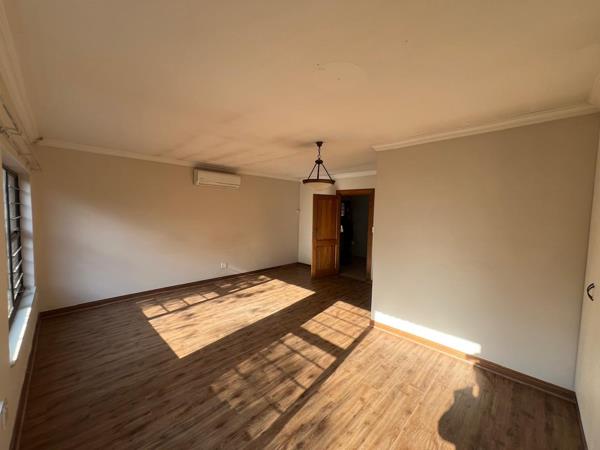 The interior boasts contemporary wood-look flooring, neutral wall tones and elegant crown molding, providing a sophisticated and versatile canvas. An open-plan lounge and dining area facilitate seamless interaction. The functional kitchen, equipped with a pantry, caters to culinary requirements. Air conditioning units ensure comfort across seasons. Bathrooms are fully tiled, presenting a clean aesthetic, with one offering a corner bathtub and another featuring both a bathtub and a separate glass-enclosed shower. Designed for discerning professionals or families, this property allows for a personalized interior styling. The spacious layout accommodates various lifestyle needs.