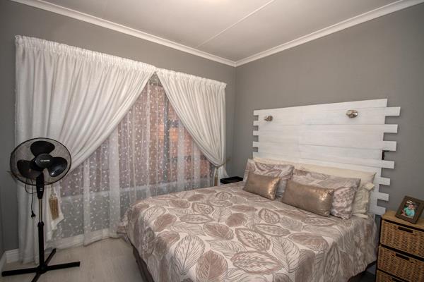 The home boasts three generously sized bedrooms, all with laminate flooring and built-in cupboards BIC. The master bedroom is particularly spacious, offering an abundance of storage space. The passage bathroom is modern, fully tiled, and features neat blinds, while the main en-suite MES is equally impressive, offering a full bathroom experience.