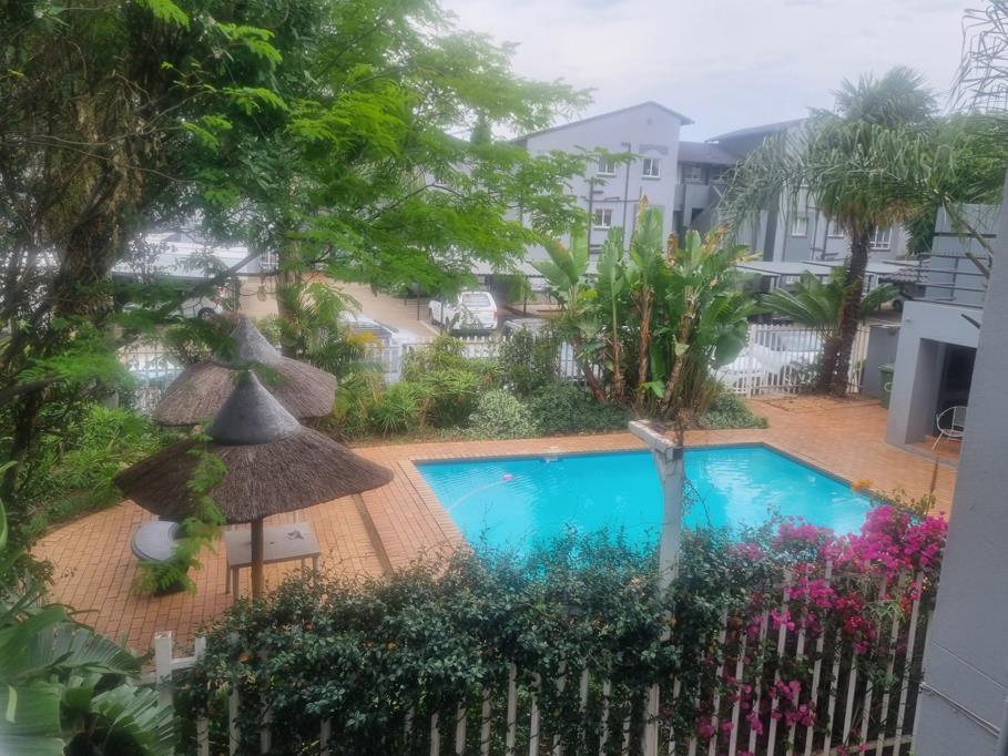 Sunny enclosed balcony with a view of the swimming pool in the complex.
