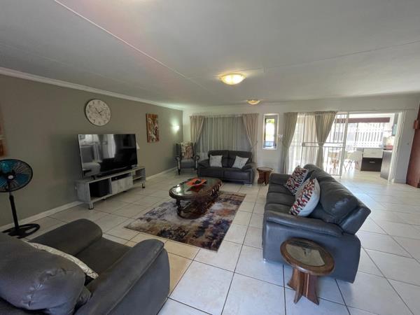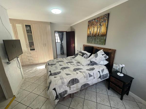 The unit has a massive living are with a fully equipped, open plan lounge and dining room area. The kitchen features a breakfast counter, ample packing space, and additional appliances. From the kitchen you lead out to your backyard with a patio area, boma and private garden space. The property is NOT pet friendly.
