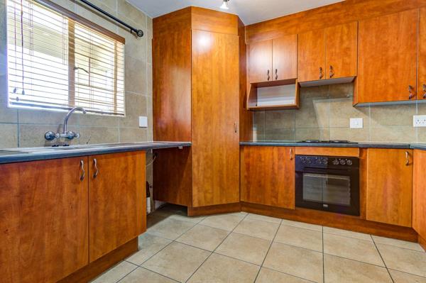 This inviting residential rental in Norton Park, Benoni, offers comfortable living within a well-maintained complex. The unit features two bedrooms and two bathrooms, providing ample space. An open-plan lounge enhances the sense of space and flow. The functional kitchen is equipped with extensive wooden cabinetry for abundant storage, an integrated oven and hob, tiled floors, and a practical double sink under a window.