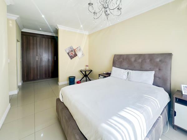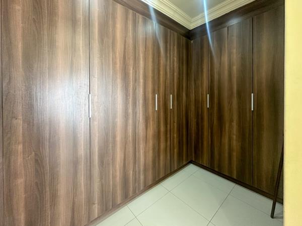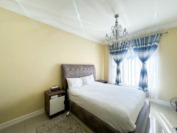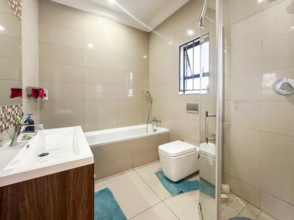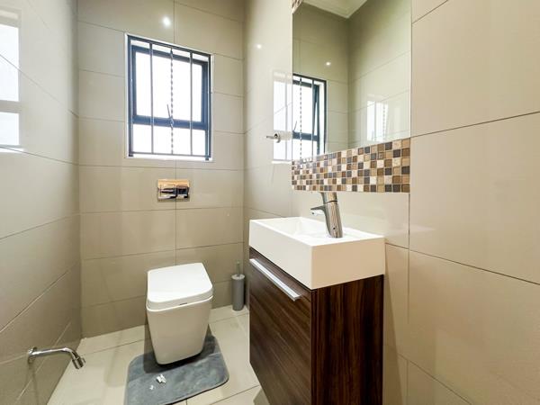 The home features three spacious bedrooms, each fitted with built-in cupboards, along with two full bathrooms and a guest bathroom for added practicality.