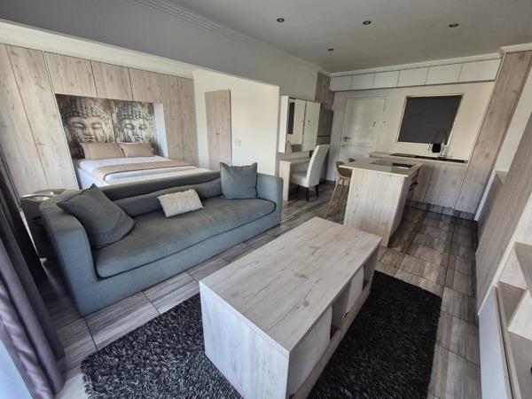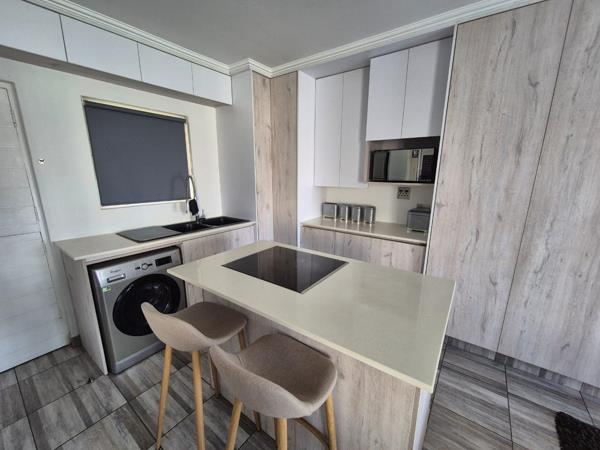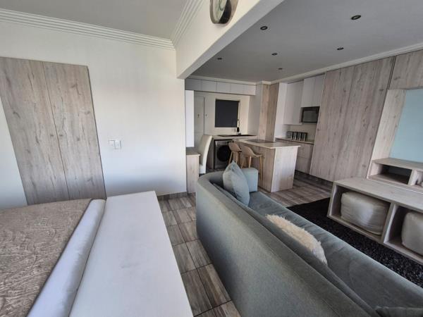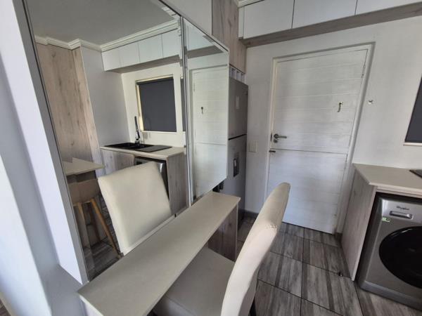 Discover modern living in this well-appointed, furnished studio apartment located within a secure estate in Morehill, Benoni. Spanning 48 square meters, this compact yet efficient space features an open-plan layout that seamlessly integrates the living, sleeping, and kitchen areas. The contemporary design is highlighted by light wood-look cabinetry, sleek finishes, and recessed lighting, creating a bright and inviting atmosphere. The modern kitchenette is equipped with an integrated stovetop, ample storage, and a convenient washing machine, making it ideal for hassle-free living. A private balcony extends the living space, offering a pleasant outdoor retreat.