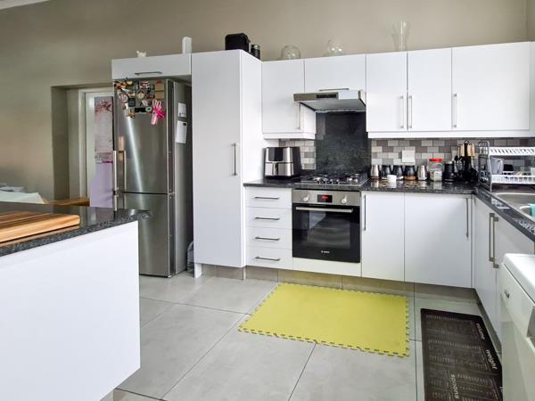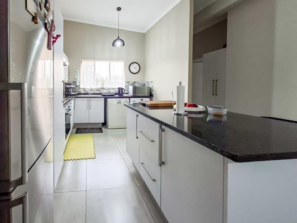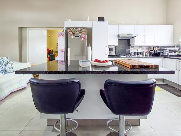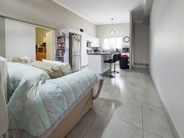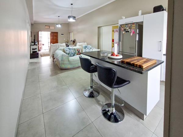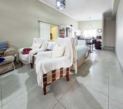 The open-plan layout seamlessly connects the tiled lounge, dining room, and kitchen, making the space ideal for everyday living and entertaining.