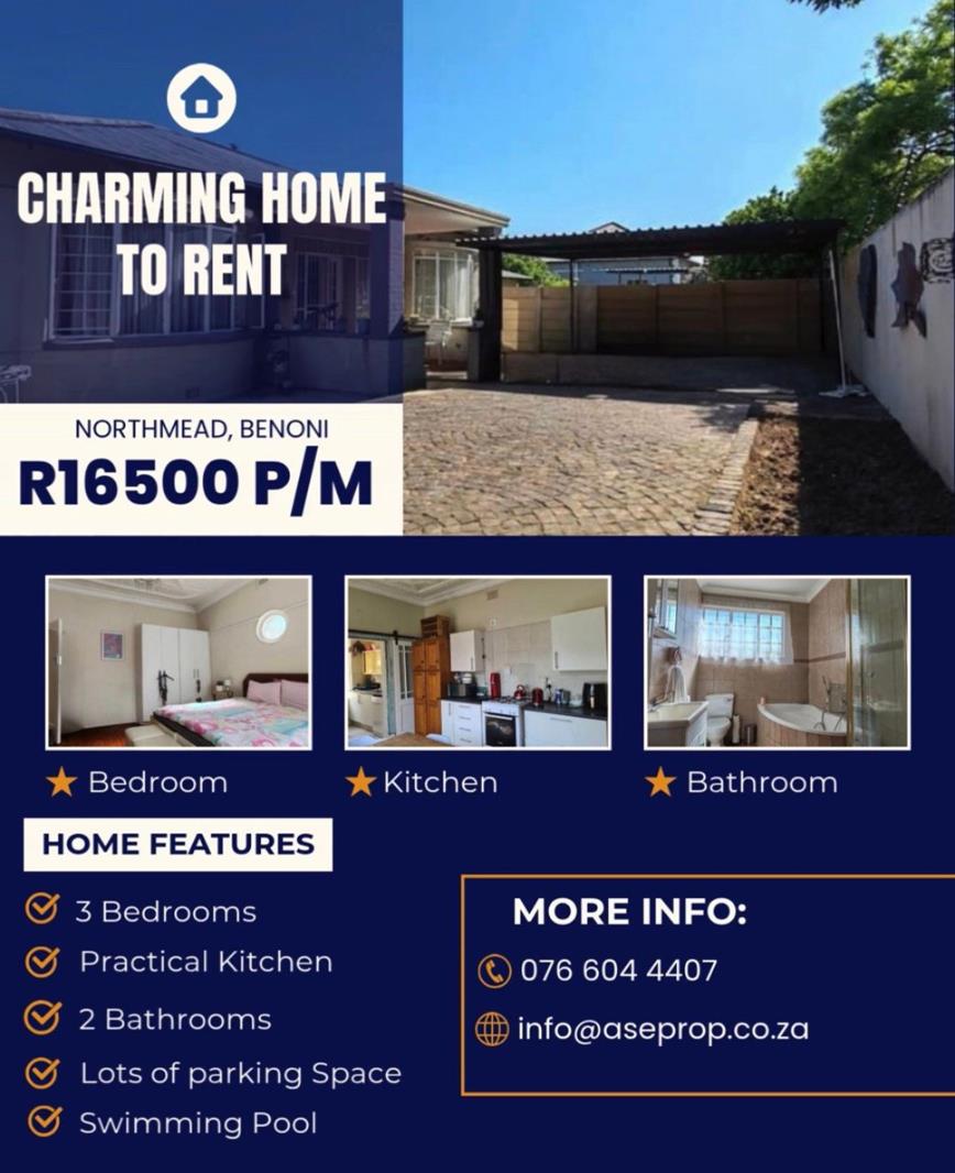 Step into a welcoming Northmead residence where warmth, practicality and a touch of character come together for effortless family living. This three bedroom home features wooden floors throughout the living spaces and bedrooms, with built in cupboards offering ample storage. Two full bathrooms, including an en suite, are tiled for easy upkeep, while a practical kitchen with a gas hob and scullery opens to the dining area, ideal for everyday meals and family gatherings. The large lounge provides a cosy center for relaxation, and the homes classic detailing is complemented by a decorative ceiling and fenced exterior that keeps everyday activities neatly contained. A breezy splash pool invites cooling down on hot days and the fully fenced garden creates a secure play space for little ones or pets, who are welcome here. Fibre internet ensures smooth connectivity for work or entertainment from home, and youll appreciate the practical layout, ample parking and a covered area perfect for casual braai''s and outdoor gatherings. This rental is perfectly suited to a family seeking a comfortable, liveable home with a touch of character in a sought after Benoni neighborhood.