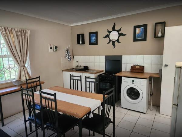 This completely renovated, fully furnished 1 bedroom free standing garden cottage is set in quiet, secure and peaceful surroundings, making it ideal for a single person or couple. 1 Spacious bedroom with ample build in cupboards. 1 En-Suite bathroom, separate open plan kitchen, lounge and dining area. Tiled throughout, gas geyser and stove, prepaid electricity. Single garage parking, remote control access. Private lapa with braai area, large wooden table and bench, swimming pool available for tenants use.