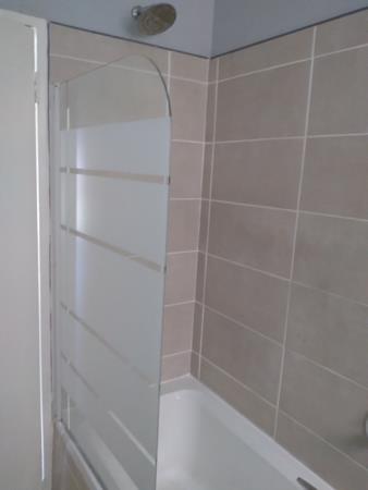 One bathroom with bath and shower.