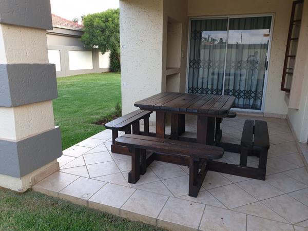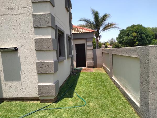 This neat 3 bedroom cluster is available from 1 June to rent . The unit has an enclosed yard almost wrap around .You can enter the house from the front gate or garage ,You have 3 bedrooms upstairs with the lounge dining room and kitchen downstairs ,The cluster also has a pressure pump and backup water if needed.