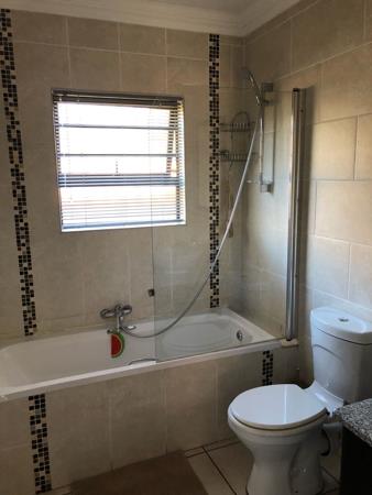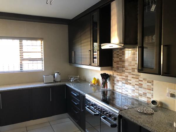 The house offers an automated double garage, leading directly into the house. The kitchen has a gas stove and a gaselectric oven, granite tops, space for 2 appliances, single door fridge as well as separate a scullery and a pantry. All 3 bedrooms are fitted with laminate flooring, built in cupboards and blinds, and main en-suite, with both a shower and bath. The guest bathroom is fitted with a bathshower. The TV roomlounge area opens out onto the enclosed patio and garden, with a built in braai.