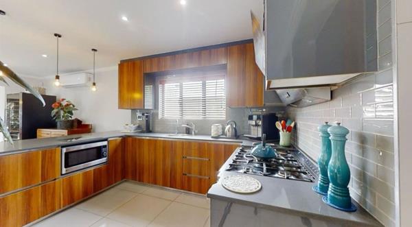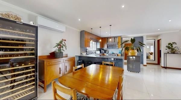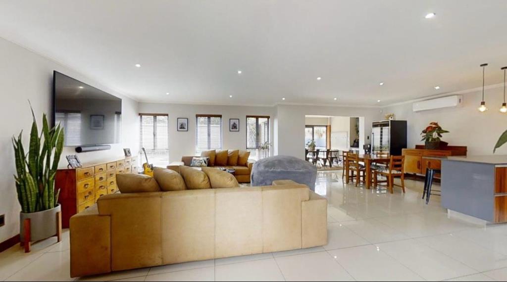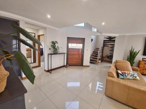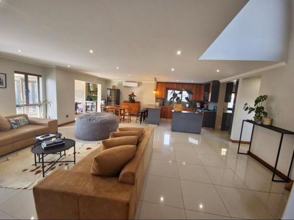 This modern 4-bedroom, 3-bathroom residence, with two en-suite bathrooms, offers an exceptional rental opportunity within a secure estate. Upon entering through the welcoming entrance hall, you are greeted by a bright, open-plan living environment. The spacious lounge and dining areas seamlessly connect, featuring glossy tiled floors, ample natural light from large windows, and contemporary recessed lighting. The heart of the home is a stylish, open-plan kitchen, boasting two-tone cabinetry, sleek countertops, a large island with seating, integrated appliances including a microwave and gas stove, and a convenient wine cooler. Air conditioning ensures comfort throughout.