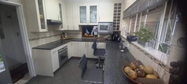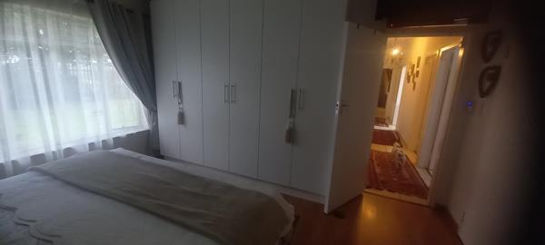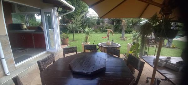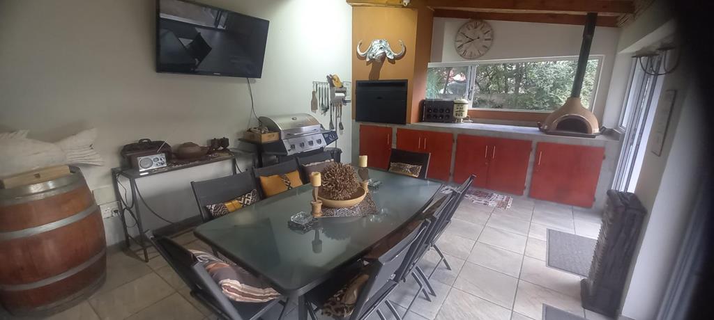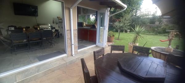 The entertainment area is gorgeous. It offers a built-in braai and a clay oven, perfect for a Sunday roast or a home made pizza. It is totally closed off and opens up to the garden with stacker doors. The garden is established with a sparkling pool.