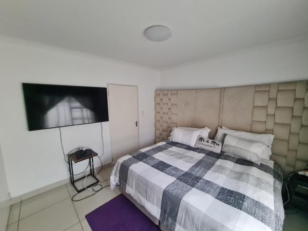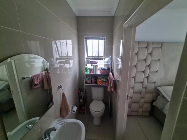 Spacious main bedroom with built-in cupboards and an en-suite shower, toilet and basin.
