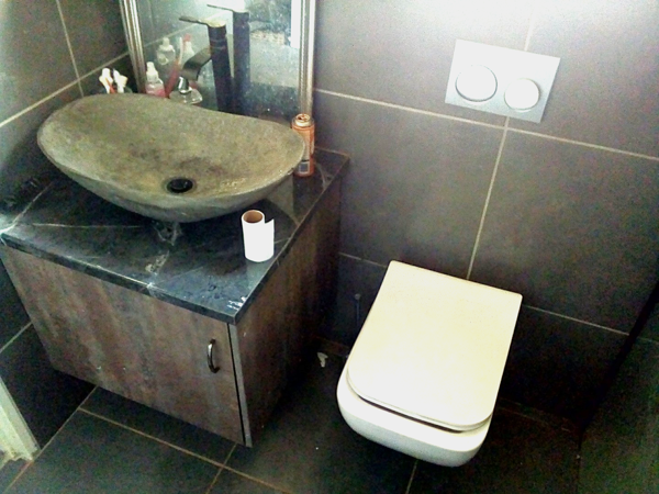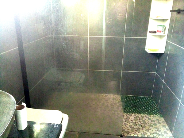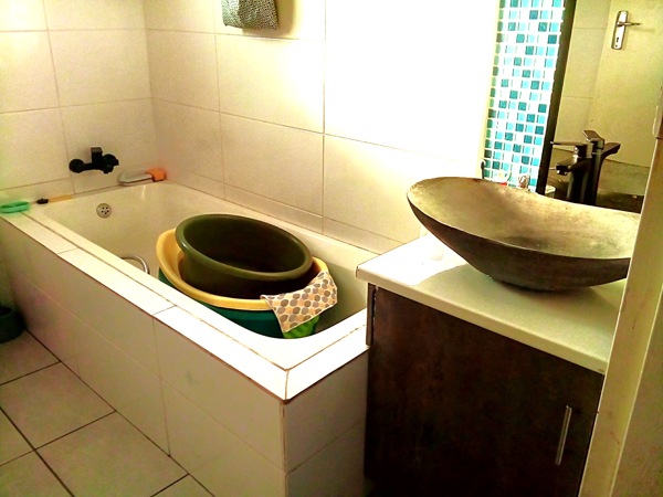 The two bathrooms are thoughtfully designed, with one featuring a bathtub, wall-hung toilet, and natural light, while the other boasts a contemporary vessel sink, sleek black faucet, dark tiling, a rain shower, and convenient vertical shelving. Energy efficiency is a key benefit, with solar water heaters contributing to lower utility costs. The property also includes a garden and paved areas, providing a neat outdoor space.