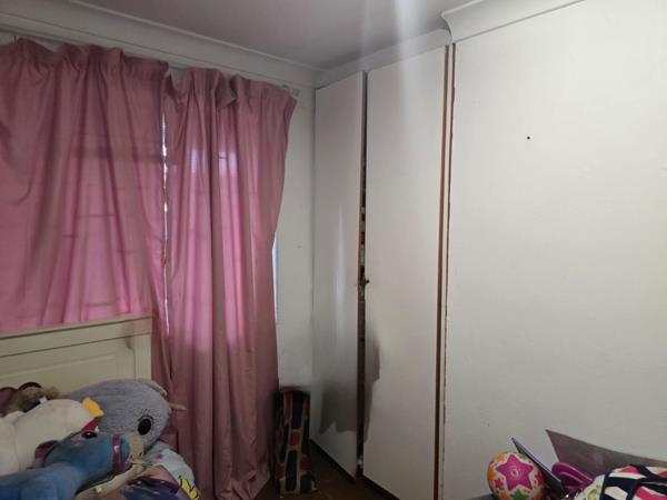 Bedroom two: built-in-cupboards, space for a queen size bed, tiled with curtain rails.