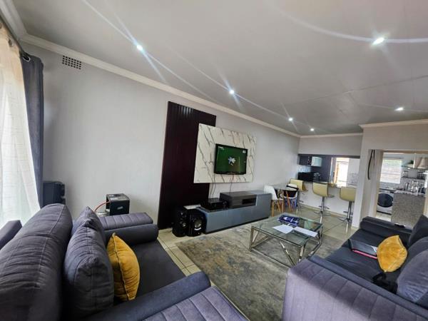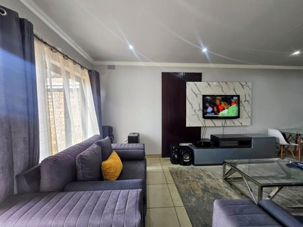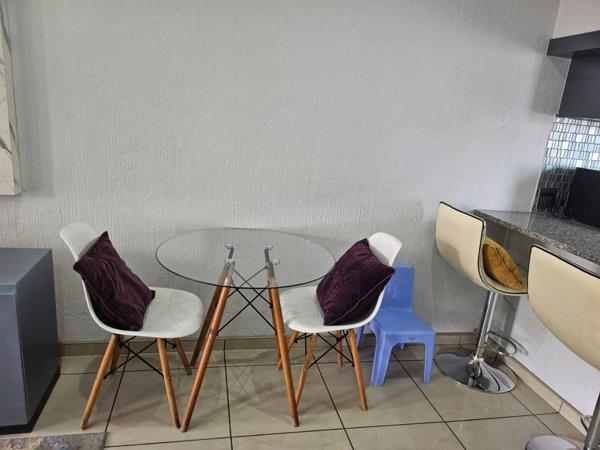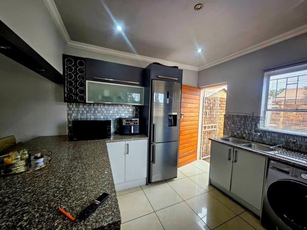 This contemporary two-bedroom, one-bathroom residence offers an exceptional rental opportunity within a secure estate in Witfield, Boksburg, a suburban area providing convenient access to local amenities and transport routes. The property features a meticulously designed open-plan layout, seamlessly integrating the lounge, dining area, and kitchen. The modern kitchen is a focal point, boasting sleek grey cabinetry, elegant granite countertops, and a stylish mosaic tile backsplash. It is fully equipped with integrated appliances, including a hob, oven, extractor fan, and a washing machine, complemented by a stainless steel refrigerator and a built-in wine rack. A functional breakfast bar provides additional seating and enhances the social aspect of the space.