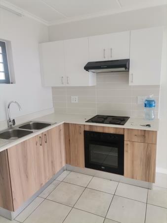 Ground-floor unit with modern kitchen quartz tops, oven, hob, extractor and open-plan living area leading to a private patio. Two tiled bedrooms with built-in cupboards main en-suite with bathtub, second bathroom with shower. Fibre & DSTV ready.